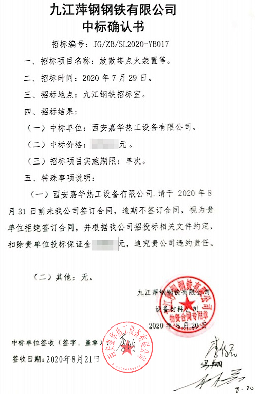 恭喜西安嘉華熱工設(shè)備有限公司于2020年08月20日收到了關(guān)于九江萍鋼鋼鐵有限公司放散塔點(diǎn)火裝置中標(biāo)通知書,本次中標(biāo)內(nèi)容為3套高爐煤氣放散點(diǎn)火裝置、1套轉(zhuǎn)爐煤氣放散點(diǎn)火裝置。